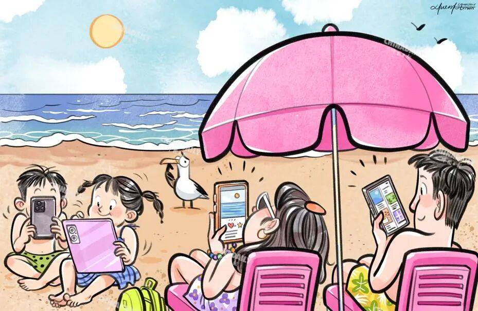 身体在度假,灵魂在刷屏。所谓的度假,不过是换了个地方签到。(来源:中国日报 李旻 英文《中国日报》2025年9月29日8版)