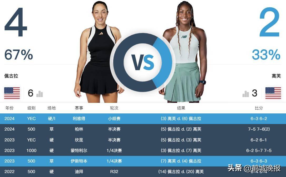 有意思的是,这两位选手过往交手6次,佩古拉以4胜2负占据上风。从历史战绩来看,佩古拉似乎更具心理优势,但高芙在去年的年终总决赛中以连赢两盘的方式击败了佩古拉,显示了强劲的势头。因此,这场决赛究竟会是谁胜谁负,赛前就充满了悬念。