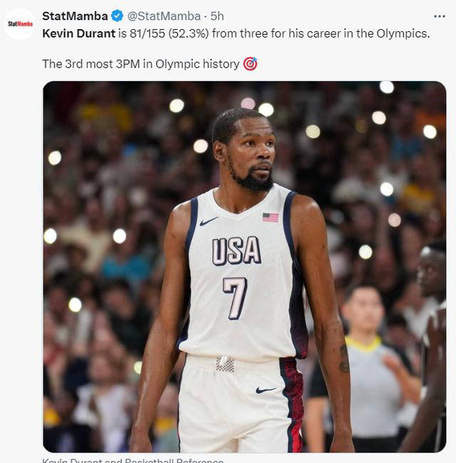 在与塞尔维亚的比赛中,杜兰特同样表现出色,贡献了全队最高的正负值+46。这两场比赛,他的三分球7投全中,使得他的奥运生涯三分命中率达到历史第三高的52.3%(155投81中)。